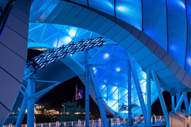 With its massive, awe-inspiring “curved wave” canopy, the new attraction is a stunning addition to the Tomorrowland skyline. Lightcycle trains appear from seemingly out of nowhere, making flowing, high-speed twists and turns beneath the gleaming canopy as they launch onto the Game Grid. The experience is even more dramatic after dark as shifting patterns of light and color create a powerful visual for riders and bystanders alike.