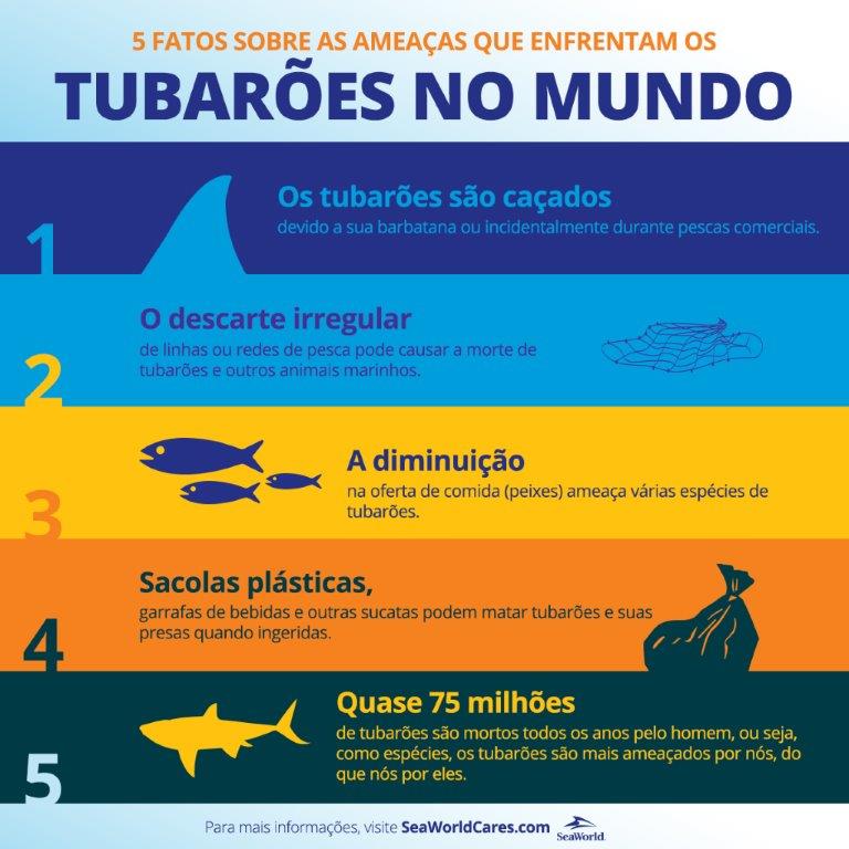 As estações também explicam como o comportamento humano está colocando em risco alguns tubarões ao ponto de extingui-los. Eles são caçados por causa de sua barbatana – considerada uma iguaria em alguns países – e também acidentalmente mortos por longas linhas de pescas ou redes de pescas comerciais. Confira abaixo outros fatos sobre os tubarões: